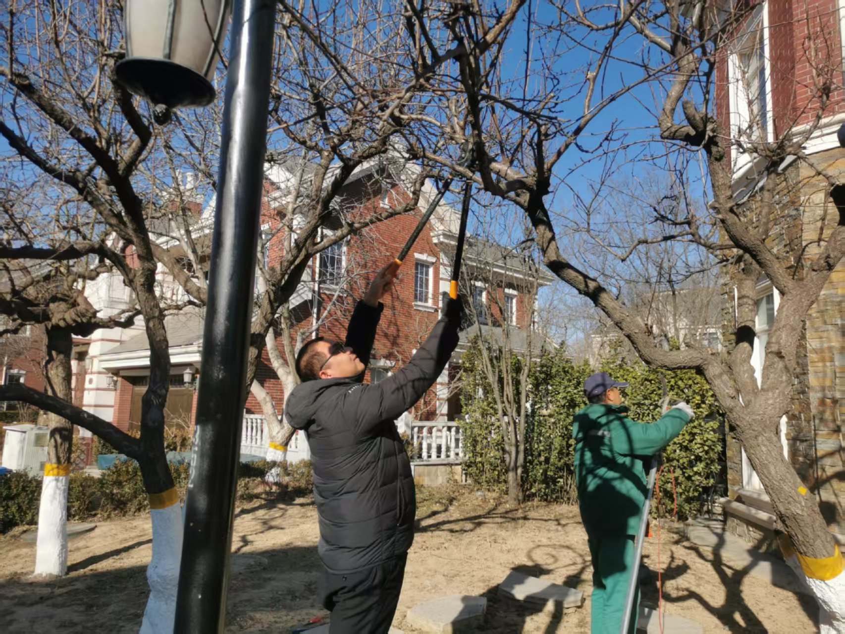 乔木修剪:剪除乔木所有干枯、患病和受损的枝条或茎,注意截面角度和芽点方位。必要时,可使用伤口愈合剂处理伤口。